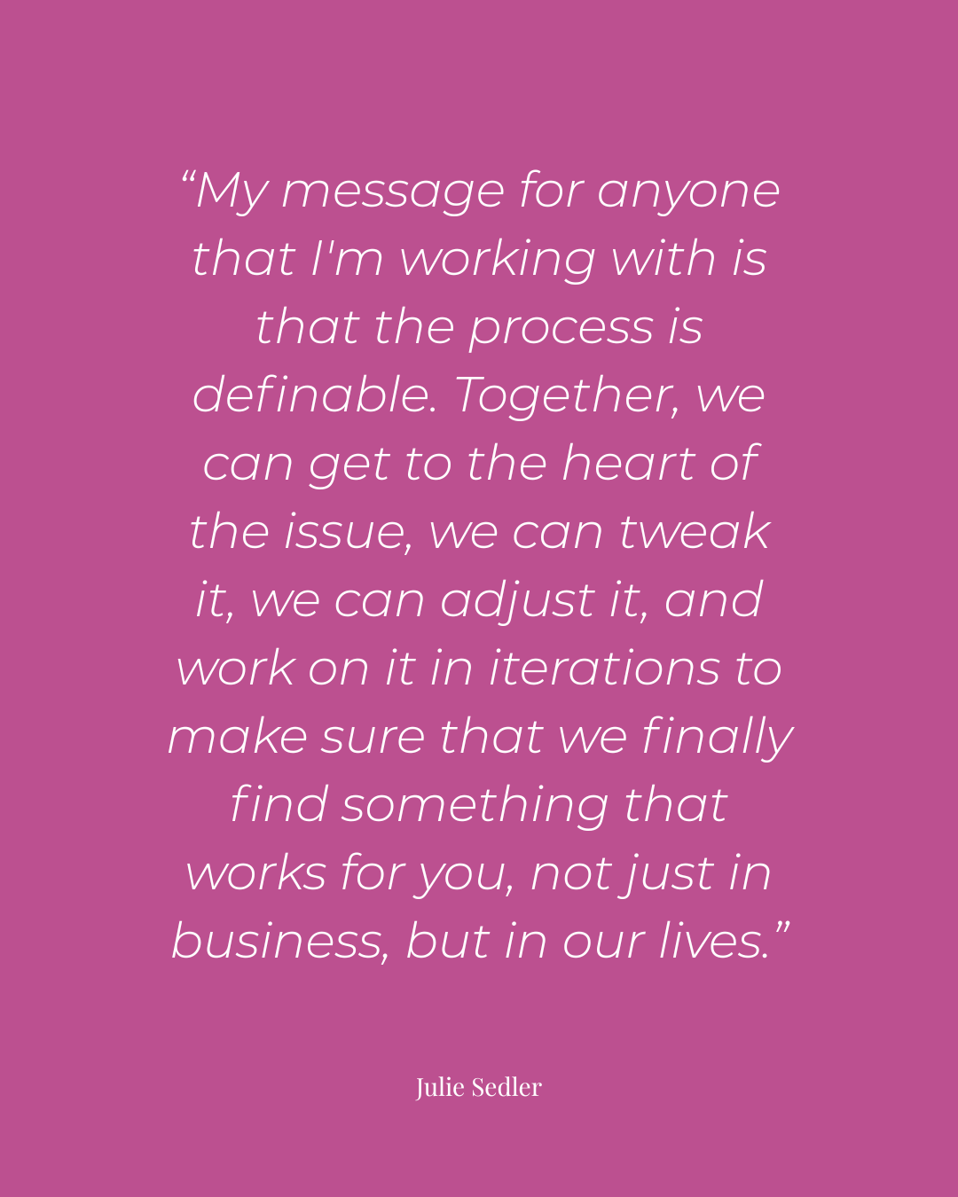 My message for anyone that I'm working with is that the process is definable. Together, we can get to the heart of the issue, we can tweak it, we can adjust it, and work on it in iterations to make sure that we finally find something that works for you, not just in business, but in our lives.